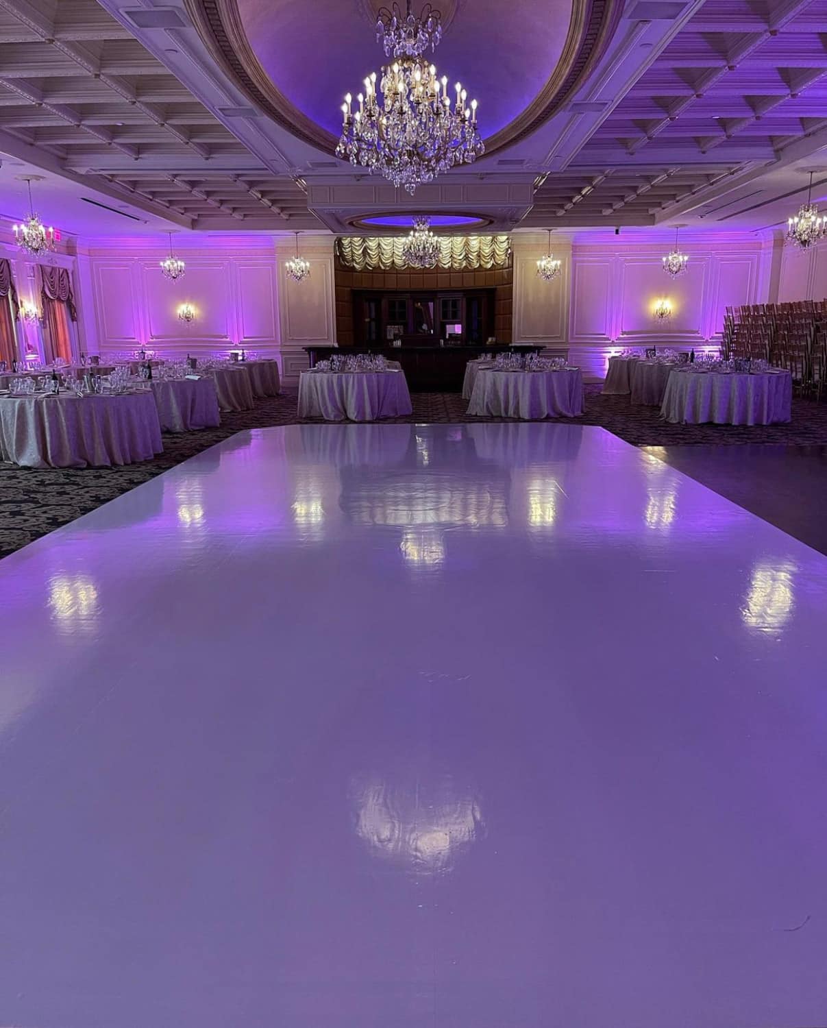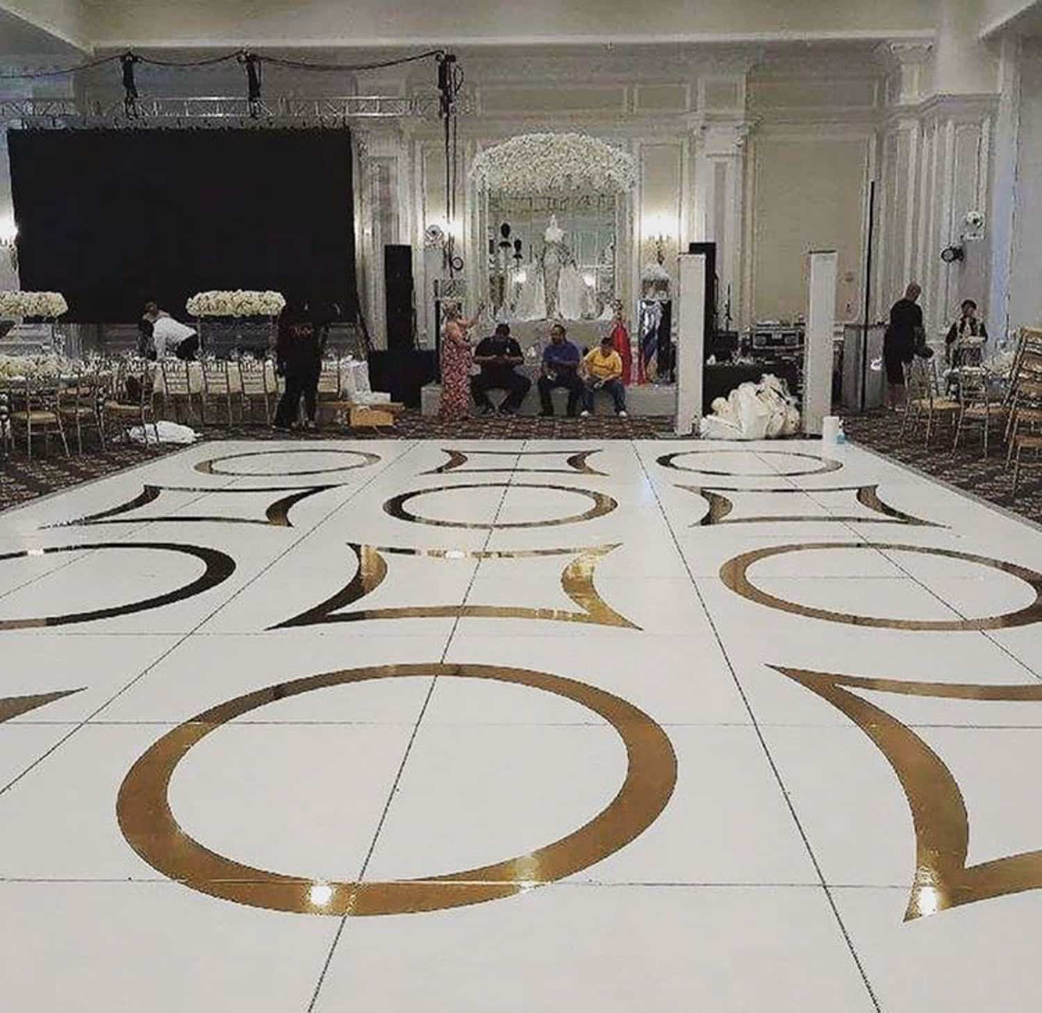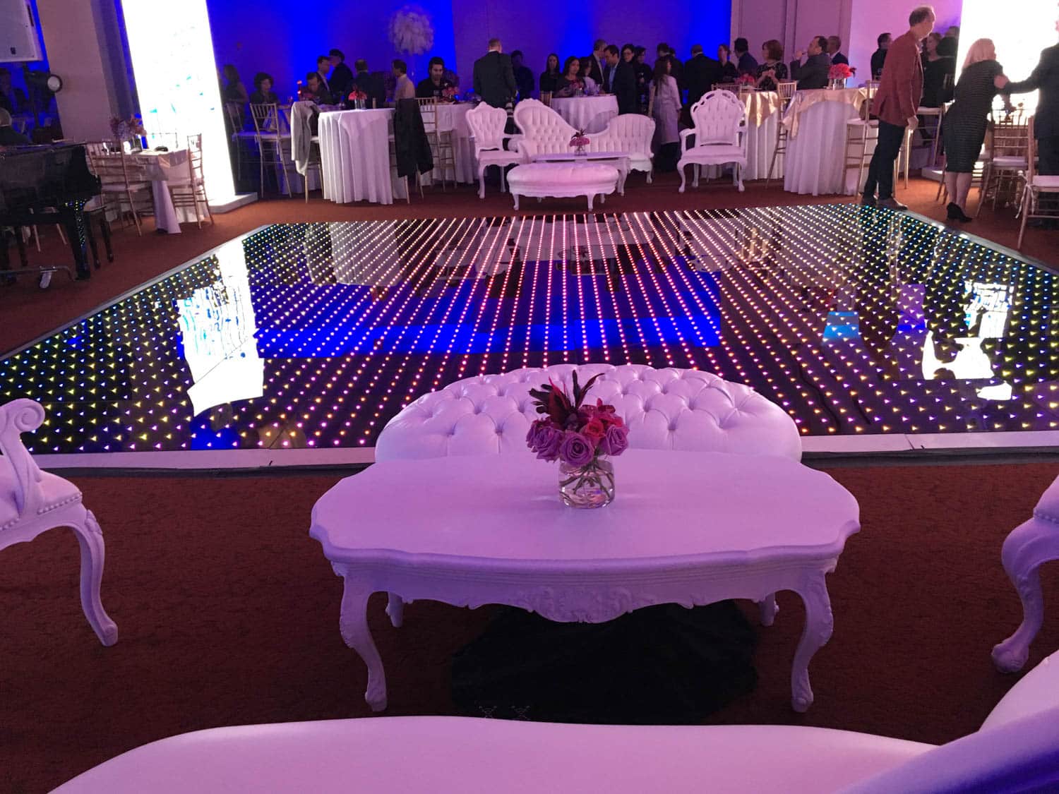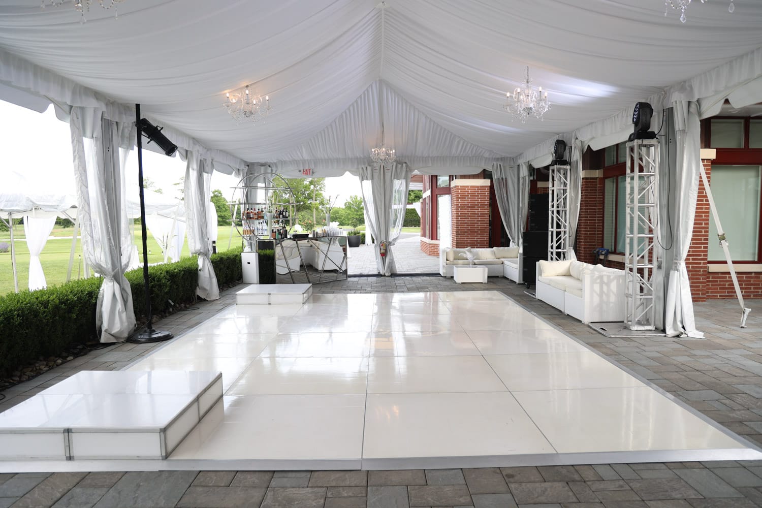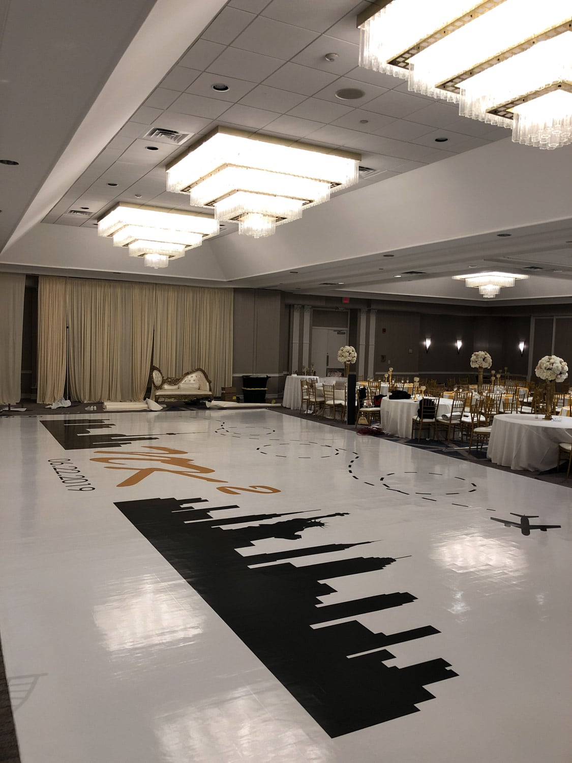 Hart to Hart’s Wedding Dance Floor Rentals create a stunning central focal point for celebrations across NYC, Long Island, NJ and CT. Our selection includes high-gloss white or black floors, parquet options, LED dance floors and fully custom vinyl-wrapped designs featuring monograms, patterns or wedding branding. A beautiful dance floor transforms the room visually while encouraging guests to gather, celebrate and enjoy your reception. We size each floor based on your venue and guest count to ensure optimal comfort and aesthetic balance.